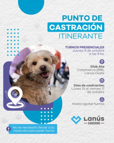Lanús Gobierno entregará nuevos turnos para la Castración Itinerante de mascotas este jueves 9 de octubre, en el Club Ata (Catamarca 2985, Lanús Oeste), ... -