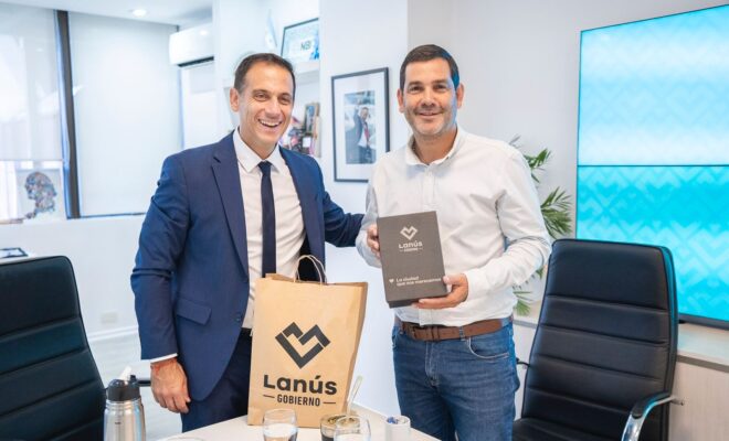 El intendente de Lanús, Julián Álvarez, recibió en su despacho del Palacio Municipal a su par de Dolores, Juan Pablo García, con quien firmó un convenio para que las vecinas y los vecinos del distrito accedan a un 30% de descuentos en la entrada a su Parque Termal Municipal, que alcanza hasta un máximo de cuatro personas por grupo familiar o acompañantes.