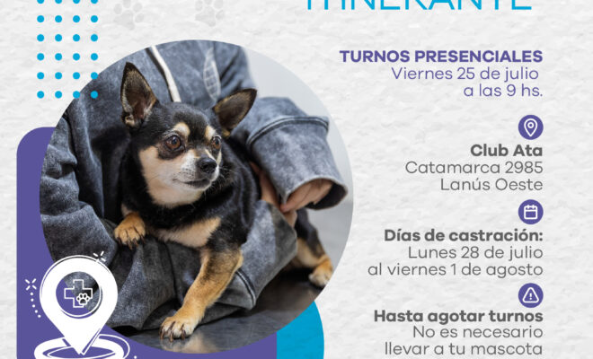 Lanús Gobierno otorgará una nueva tanda de turnos gratuitos para el servicio de Castración Itinerante de mascotas el viernes 25 de julio en el Club Ata (Catamarca 2985, Lanús Oeste). Las reservas podrán realizarse a partir de las 9 horas y se asignarán hasta agotar cupos.