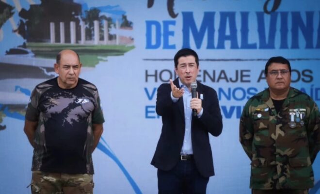 El intendente Leo Nardini abrió la ceremonia con un mensaje de reconocimiento: “Nosotros llevamos un nombre que además de recordar lo que pasó hace 44 años en aquella guerra, nos recuerda que hay que celebrar a todos los caídos que con honor y patriotismo dieron su vida, y también a quienes están acá con la tarea de mantener ese legado vivo”. Su intervención puso en valor la voz de los veteranos y el esfuerzo de quienes transmiten a las nuevas generaciones los valores de soberanía y patriotismo.