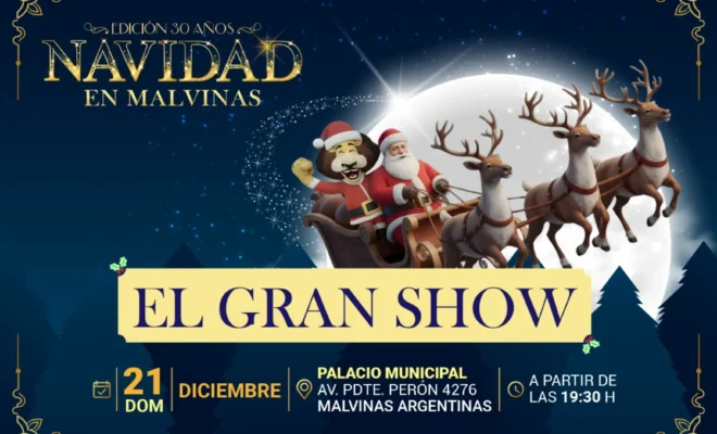 El domingo 21 de diciembre desde las 19 horas, Malvinas Argentinas realizará su Gran Show de Navidad – Edición 30 Años, en las inmediaciones del Palacio Municipal (Av. Pdte. Perón 4276). Será el cierre de la agenda navideña, con un despliegue artístico de primer nivel, con más de 100 artistas en escena sobre uno de los escenarios más grandes del país, con grandes pantallas, juegos de luces y efectos especiales. Un evento para disfrutar sentados, con estacionamiento gratuito, seguridad, puestos de hidratación, un sector para personas con discapacidad y un corredor gastronómico pensado para que las familias disfruten plenamente del encuentro.