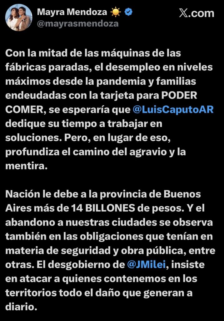 Home›Política›Mayra Mendoza respondió al posteo de Caputo